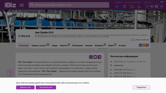 | AI-анализ | This website is for Aviprime OOO, a company specializing in the design, procurement, and installation of equipment for dairy farms, as well as their commissioning. The company is the official dealer of Digi Farm Software LLC and Delaval in Belarus. The offered equipment includes automated milking systems, milking parlors, milking on tethers, and milking on small farms. The website provides a scheme for visiting the company, contact telephone numbers, and the address of Aviprime OOO in Minsk, Belarus. |