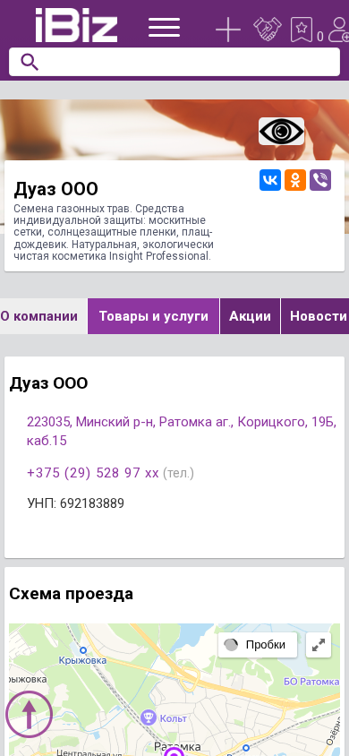 | AI-анализ | This online resource is a business website for Duaz OOO, a company specializing in the sale of seeds for lawn grass and protective individual equipment, including mosquito nets, sunscreen films, and raincoats. The company also offers natural and ecologically clean cosmetics from Insight Professional. The website provides contact information, including an address, phone number, and map for the company located in the village of Ratomka, Minsk region, Belarus. The site also features a section for announcements, vacancies, and company news. The company is listed under categories for household items, seeds, and cosmetics in Minsk. |
