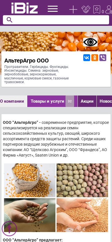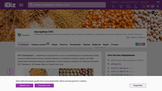 | AI-анализ | language: ru The website is for a Belarusian agricultural company named АльтерАгро ООО, specializing in the sale of seeds for various crops, as well as fertilizers and protective agents for plants. The company offers a wide range of products, including seeds for cereals, legumes, oilseeds, corn, vegetables, and sugar beets. Additionally, they sell planting materials, fertilizers, herbicides, fungicides, and insecticides. The website includes a section for purchasing seeds and provides contact information, including phone numbers, for the company located in Minsk, Belarus. The domain is registered as alter-agro.ibiz.by and is in the Russian language. |