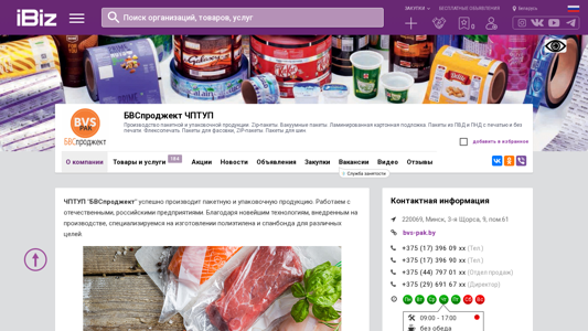 Название / Заголовок | БВСпроджект ЧПТУП - Производство пакетной и упаковочной продукции. Zip-пакеты. Вакуумные пакеты. Ламинированная картонная подложка. Пакеты из ПВД и ПНД с печатью и без печати. Флексопечать. Пакеты для фасовки, ZIP-пакеты. Пакеты для шин. . 220069, Минск, , 3-я Щорса, 9, пом.61 |