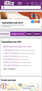 | AI-анализ | This website is for the Belarusian company ТаможПрестиж ООО, located in Минск at Володько, 6/6, 4 этаж. The company offers custom clearance services, logistics, and certification. Contact information for different services includes phone numbers +375 (29) 635 75 xx, +375 (17) 378 85 xx, +375 (17) 378 83 xx, +375 (44) 575 19 xx, and +375 (17) 234 33 xx, as well as an address and map. The website includes sections for company information, products and services, news, job openings, and customer reviews on social media platforms. The company |