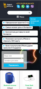 AI-анализ | This website is an e-commerce platform selling only original Apple iPhones, including models 5s, SE, 6s, 7, 8, X, XS, XR, and MAX, with delivery available in Minsk and Belarus. The top keywords are 'apple', 'iphone', and various iPhone model names, as well as related terms like 'bluetooth', 'ios', and 'screen'. The website also offers various accessories such as Bluetooth speakers, power banks, protective glass, auto holders, selfie sticks, and Bluetooth headphones. The catalog includes models iPhone 16/Pro/Max, iPhone 15/Pro/Max, iPhone 14/Pro/Max, iPhone 13/Pro/Max, iPhone 12/Pro/Max, iPhone 11/Pro/Max, and offers contacts for MTS. The website also |
