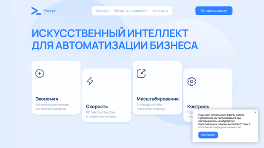 | AI-анализ | This website is dedicated to Artificial Intelligence (AI) for business automation. The description emphasizes the benefits of AI in business, such as cost savings, faster and more accurate decision-making, and scalability. The mission of the website is to provide custom AI solutions for various business sectors including legal, HR, marketing, finance, production, and customer service. The main focus is on process automation and efficiency improvement. The website offers solutions for areas like accounting and production planning, identifying bottlenecks, optimizing processes, generating instructions and standards, analyzing energy consumption, recognizing defects, predicting equipment failures, increasing average order value, creating personalized email campaigns, recommending products, returning customers through retargeting, enhancing conversion rates, analyzing customer behavior in real-time, and automating pricing based on demand and competition. The domain is prompting.by. |