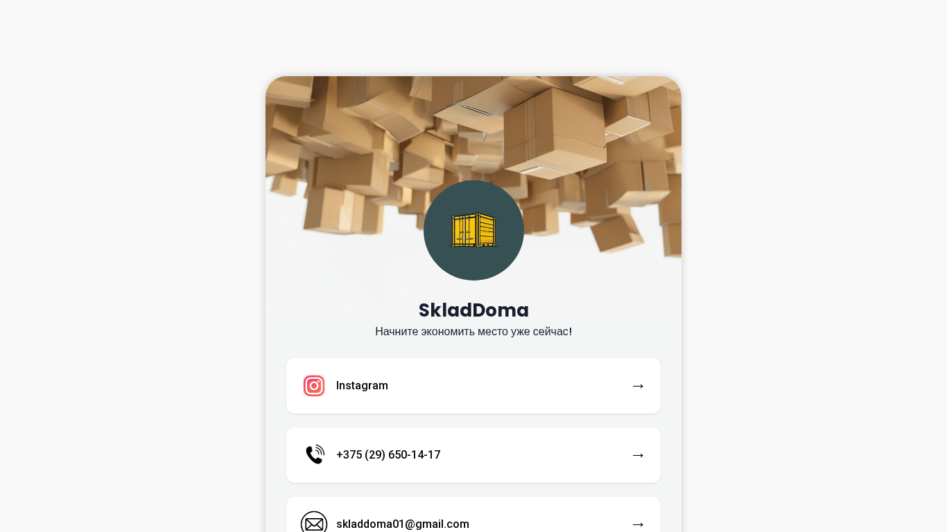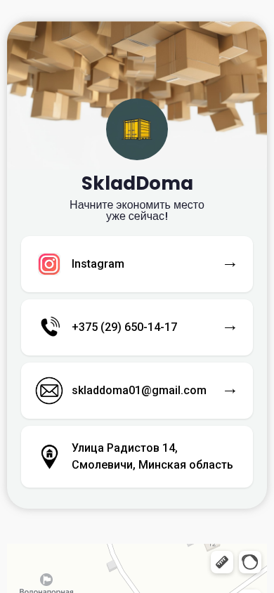 | Адрес | Начните экономить место уже сейчас!, Instagram, →, +375 (29) 650-14-17, →, skladdoma01@gmail.com, →, Улица Радистов 14 |
