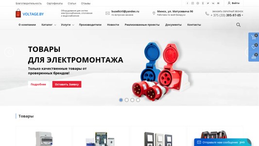 | AI-анализ | The web project Voltage.by is a Belarusian e-commerce website specializing in equipment sales for electrical power systems, heating, and water supply. The website offers various services, including full installation and commissioning of systems, installation and commissioning of CCTV systems, smart home automation, and electrical wiring systems. The company is based in Minsk, Belarus, and can be contacted via email or phone for inquiries and orders. They provide services across Belarus and offer installation services with a reverse call option. The catalog includes a wide range of products, such as electric meters, charging devices for electric transport, modular equipment, plastic and metal enclosures, lighting technology, installation tools, and cable laying systems. The company also mentions several manufacturers, including Electrolux, Ballu, Royal, Thermo, Nibe, Uni-fitt, Tiemme, A |
