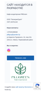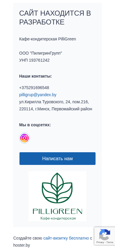| AI-анализ | The web project "PilliGreen Cafe-Confectionery OOO" is currently under development. The business, registered under the name "ПилигринГрупп" and UNS number 193761242, is a cafe-confectionery based in Minsk, Belarus. Contact details provided are a phone number +375291696548 and email pilligrup@yandex.by, with a mailing address at ul.Кирилла Туровского, 24, пом.216, 220114. The website's design is not yet complete and includes a contact form for users to send messages. Social media links are also provided, encouraging visitors to connect with the business. The domain name is pilligreen.by. |