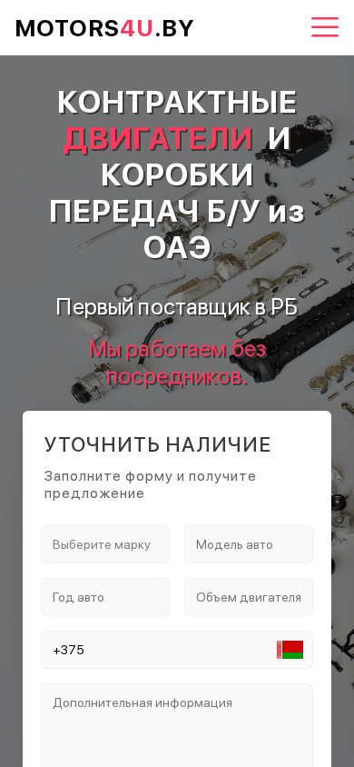 | AI-анализ | This website, titled "Продажа контрактных двигателей | Motors4u," is a Belarusian .BY domain that sells used contract engines from the OAE (United Arab Emirates) in various models, including Infiniti, Mercedes, Toyota, Lexus, Kia, Hyundai, Chrysler, Mazda, Volvo, Nissan, Mitsubishi, Land Rover, and Honda. They claim to be the first importer of these engines in Belarus and to work directly with clients without intermediaries. They offer a wide range of engines and transmissions on their Minsk-based warehouse, with resources having a maximum run of 200,000 km. The website provides a form to request a quote and mentions a 30-day guarantee for engine testing and installation. They deliver across Belar |
