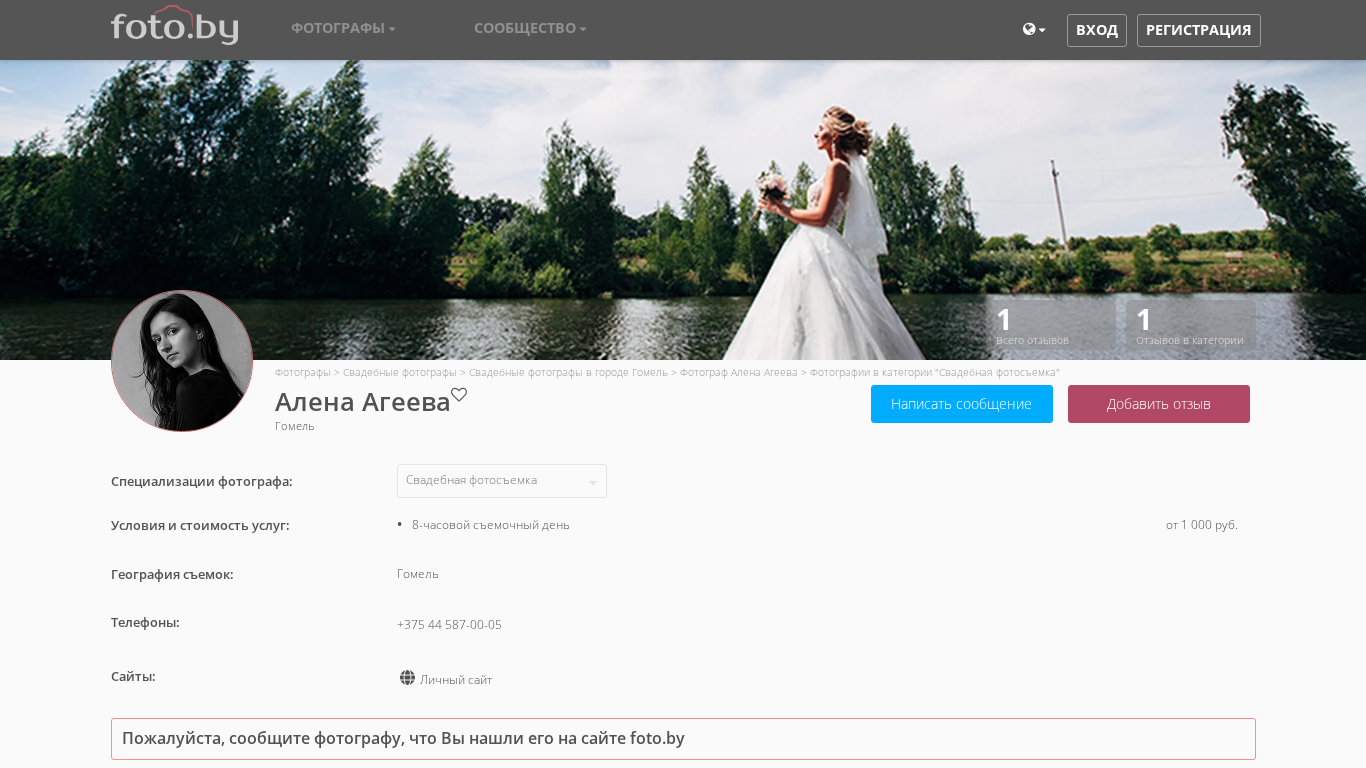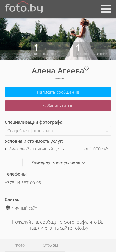| AI-анализ | The website is a portfolio of photographer Alena Ageeva, based in the city of Homel, Belarus. The main page of the site showcases her work in the "Wedding Photography" category, with 1 review available. The photographer specializes in wedding, maternity, and christening photography. The pricing for an 8-hour shooting day is 1,000 rubles. The photographer's contact information, including a phone number and personal website link, is provided. The website also features a blog and a section for testimonials. The domain is ageeva.foto.by. |