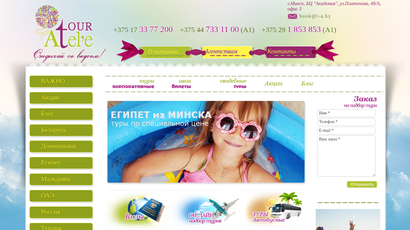 | SEO-описание | Большой выбор туров по низким ценам с вылетом из Минска, Москвы, Киева. Раннее бронирование, горящие туры, визы, экскурсии, Новости. |