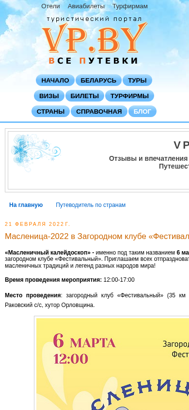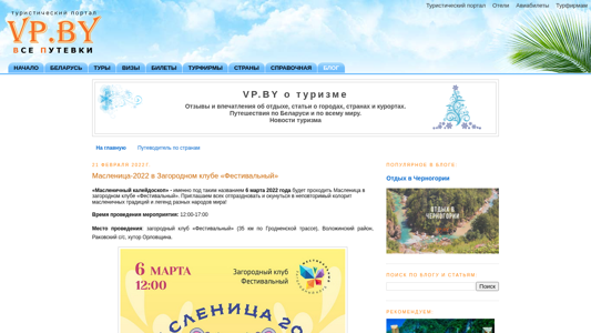 | AI-анализ | The web project VP.BY о туризме is a tourist portal that offers information on hotels, airline tickets, tour companies, travel destinations, and services related to visas and tickets. The website features articles about cities, countries, and resorts, as well as travel experiences and news in the tourism industry. It also includes a blog section where users can write and share their own travel stories. The website mentions various events and exhibitions, such as the 'Масленица-2022' event at the 'Фестивальный' club in March 2022 and the 'ОТДЫХ-2022' tourist fair in Minsk from March 31 to April 2, 2022. Older mentions include the 'ОТДЫХ-2021' tourist fair in Minsk from April 23 to |