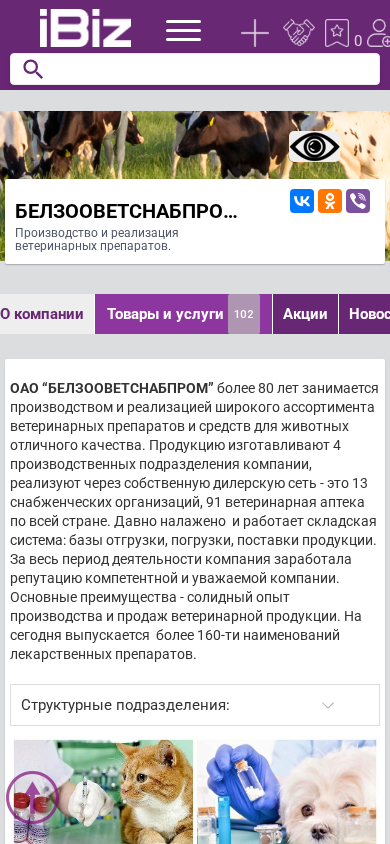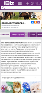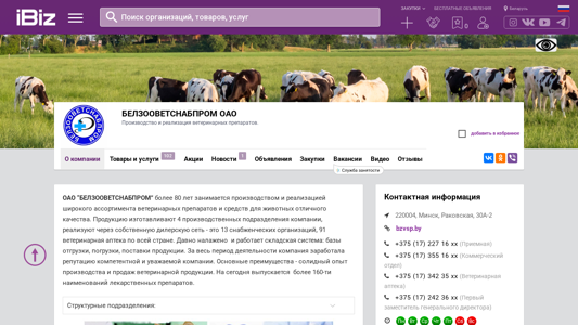 | AI-анализ | The web project "БЕЛЗООВЕТСНАБПРОМ ОАО" is a Belarusian company specializing in the production and sale of veterinary preparations and related services for animals. With over 80 years of experience, the company has established a reputation as a competent and respected entity in the industry. It operates four manufacturing divisions and sells its products through a network of 13 distribution organizations and 91 veterinary pharmacies across the country. The company boasts a well-established warehouse system, including shipping, receiving, and distribution centers. The company's extensive product range includes over 160 different veterinary medications. Structural units include the Brest, Baranovich, Ruden, Pinsk, Homel, Vitsebsk, Mogilev, Polotsk, Baza Belzooetsnab |