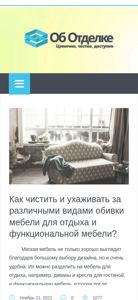 | AI-анализ | --- The website "Saite Ob Otdeleke" (Site About Finishing) is dedicated to techniques, secrets, and hacks from real professionals in finishing. The site covers topics on plastering, gypsum board finishing, electricity, materials, and more. It includes sections on how to clean and maintain various types of upholstery on furniture for leisure and functional use. The site differentiates between upholstery for leisure, such as sofas and armchairs for living rooms, and functional upholstery, which can be transformed into beds. The site discusses four main types of fabric used in upholstery production: velour, velvet, jacquard, and microfiber. Each fabric requires specific care to maintain its appearance and longevity. The site also covers leather and leather products, which look exclusive and can last for a long time but require proper |