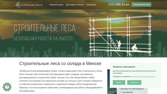 | AI-анализ | --- This online resource is a catalog for buying framed timber construction beams (lumber) in Minsk, Belarus, from the company ЛРСП, with prices starting from 200 rubles. Users can purchase dismantlable metallic construction beams, with guarantees, customer service, delivery, and installment plans. The site uses cookie files for user convenience, and users are encouraged to review the privacy policy. The company provides delivery and payment information, along with a contact phone number for consultation and a form for requesting a specialist's consultation. The website also offers information on the importance of using construction beams for height work and provides details on available products, such as the LRSP-30 and LRSP-40, with different heights, widths, and load capacities, and their respective prices. The site provides a link to buy each product directly |