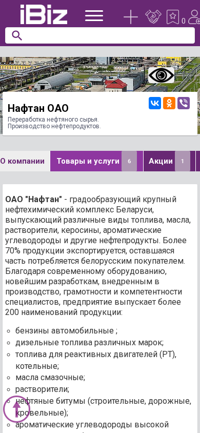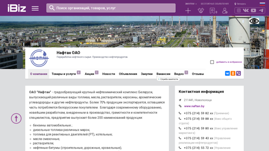 | AI-анализ | The website "Naftan OAO" is a Belarusian company located in Novopolotsk, specializing in the refining of crude oil and the production of various petroleum products. The company produces a wide range of fuels, lubricants, solvents, bitumen, and aromatic hydrocarbons, exporting over 70% of its output. The website includes sections for company information, products and services, news, announcements, vacancies, and customer reviews. It offers a personal cabinet for users, allowing them to save favorite items, view company news, and access various contacts such as phone numbers, fax numbers, and addresses. The company places great emphasis on environmental protection and the well-being of its employees, providing facilities like a sanatorium, cultural center, medical services, a tourist base, a children's health camp, and a sports complex. The |