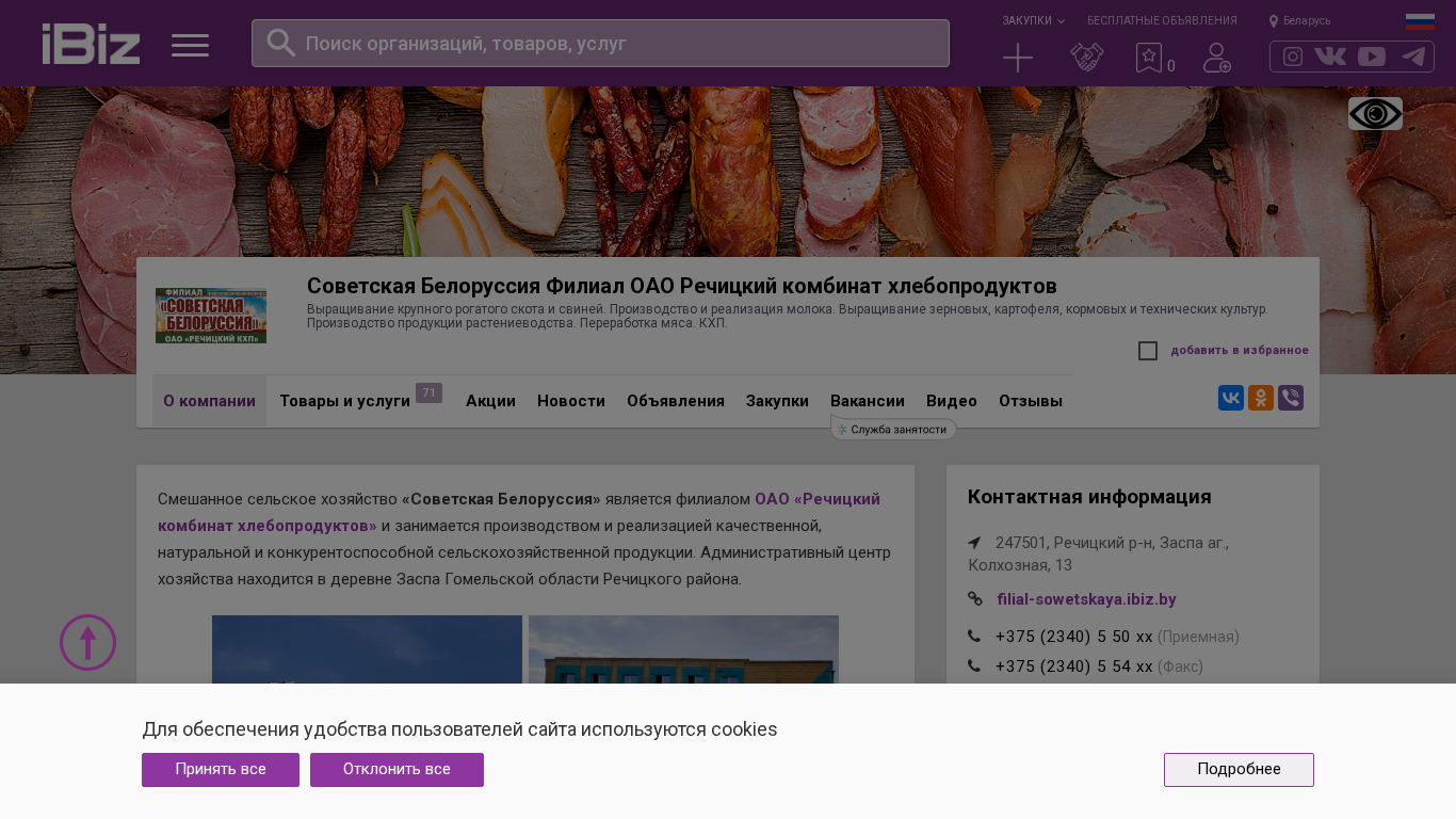 | AI-анализ | The portal is a branch of OAO Rechitsky Bread Products Combine - Soviet Belarus Branch, specializing in the production and sale of high-quality, natural, and competitive livestock farming and agricultural products. The administrative center of the farm is located in the village of Zaspa in the Homel Oblast of Rechitsky District, Belarus. The main activities of the branch include milk production from cattle, meat production from cattle and pigs, meat processing, cultivation of grains, cereals, corn, and technical crops, and potato farming. The agricultural complex consists of a swine farm with 24,000 pig heads, five grain drying facilities, three grain storage facilities, a livestock farm, a meat processing plant, a mechanized transport park, repair and mechanical workshops, a sawmill, and a rapeseed oil production facility. Liv |