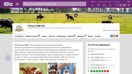 | AI-анализ | The website is for OAO "Polesye OBM" - a leading agricultural company in Shtolinsky district, specialized in cattle farming and crop production with a focus on meat-dairy livestock farming. The company produces and sells grain, milk, beef, and livestock feed. Major subdivisions include "Maleshovo" and "Olgomel" MTFs, and a calf-raising farm "Sulin". The total land area is 3,554 ha, of which 2,882 ha are agricultural lands, including 1,498 ha of arable land and 1,384 ha of meadows. The soil fertility index is 42.1. OAO "Polesye OBM" offers services in the agricultural sector and has a repair workshop, canteen, and machine-tractor park. Recent |