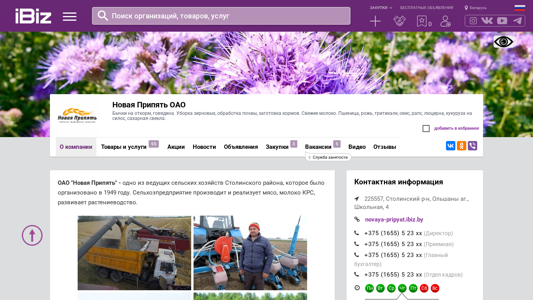 | AI-анализ | The web project "Новая Припять ОАО" is a leading agricultural enterprise in the Sтолинский район, established in 1949. The farm produces and sells livestock meat, milk, and develops crop farming. The farm grows wheat, barley, triticale, oats, rapeseed, soybeans, corn for silage, and sugar beets. The farm owns 6,000 hectares of agricultural land, 3,600 hectares of which are arable fields. The farm offers: Livestock milk; Cattle for fattening; Beef; Cereals, legume crops; Sugar beets, rapeseed, soybeans; Animal feed. The cattle herd consisted of 7,897 heads on August 1, 2020, including 1,8 |