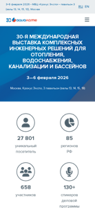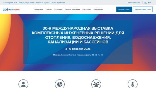 | AI-анализ | The website is dedicated to the International Engineering Solutions Exhibition Aquaflame 2026. It provides information about the event, which is a 30th international trade show for residential and industrial equipment related to heating, water supply, engineering-sanitary systems, pools, saunas, and spas. The exhibition takes place at the Crocus Expo Center in Moscow, Russia from February 3-6, 2026. The website offers contact information, participant lists, product information, floor plans, and reports from previous years. It also includes details on registration, rules for entry into Russia, accommodation options, and various services for attendees. The website is organized by a specific sector, Pool&Spa, and features official support, partnership opportunities, and sponsorship information. It offers various benefits for exhibitors, including visibility and networking opportunities. Users can book a stand and find rules for |