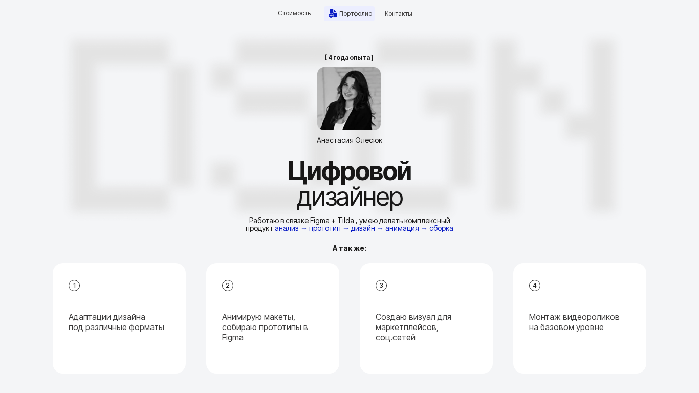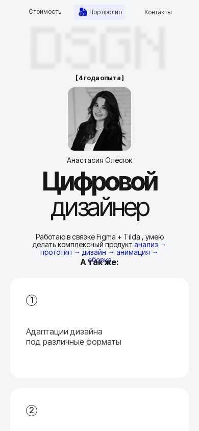 | AI-анализ | The web project "NastyaOlesiuk.site" is a full-service website development company offering over 30 custom website projects. The company specializes in Figma and Tilda for comprehensive product analysis, prototype, design, animation, and assembly. The portfolio showcases various projects, including design adaptations for different formats, animated mockups, and prototypes, as well as visuals for marketplaces and social networks. Additionally, the designer offers video montages on a basic level and a strong site through two stages: positioning concepts and design with pixel-perfect verification. The designer positions the project by presenting several positioning concepts, discussing references, and creating a unique design based on the client's brand and positioning. The website development includes creating pixel-perfect designs, adapting to various devices, and adding animations to capture and retain user attention. The designer ensures a recognizable style |