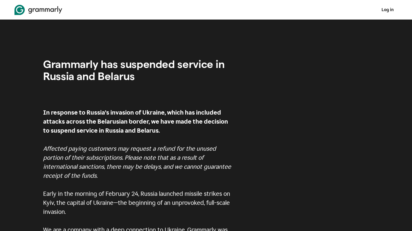 | AI-анализ | language: en The portal, Grammarly, is a writing assistant platform that has suspended its service in Russia and Belarus in response to Russia’s invasion of Ukraine. The company, which was founded in Ukraine and has team members residing there, urges users to seek credible information about the war from trustworthy sources. Affected paying customers may request a refund for the unused portion of their subscriptions, but note that delays may occur due to international sanctions. The invasion began on February 24, 2022, with missile strikes on Kyiv, the capital of Ukraine. The company expresses hope that the war ends quickly and that Ukraine is recognized as a free and independent nation. |