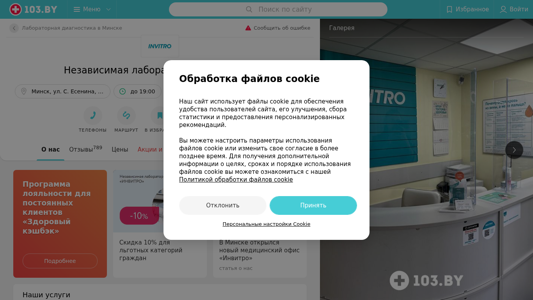 | AI-анализ | The portal invitro-25.103.by is a medical website featuring an independent laboratory named INVITRO located at ul. S. Esenina 60 in Minsk, Belarus. The website provides contact information such as phone numbers, work hours, and customer reviews. Users can access information about the laboratory's various services and locations, as well as view photos, read reviews, and learn about loyalty programs and discounts. INVITRO is an international medical company that has been operating in Belarus for over 20 years, offering over 1,800 types of laboratory investigations, including ultrasound and gynecological diagnostics. The lab uses advanced equipment from Japanese, Swiss, and American manufacturers, and employs original reagents for analysis. Results of investigations can be obtained either by visiting the medical office or by sending them via email |