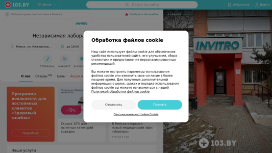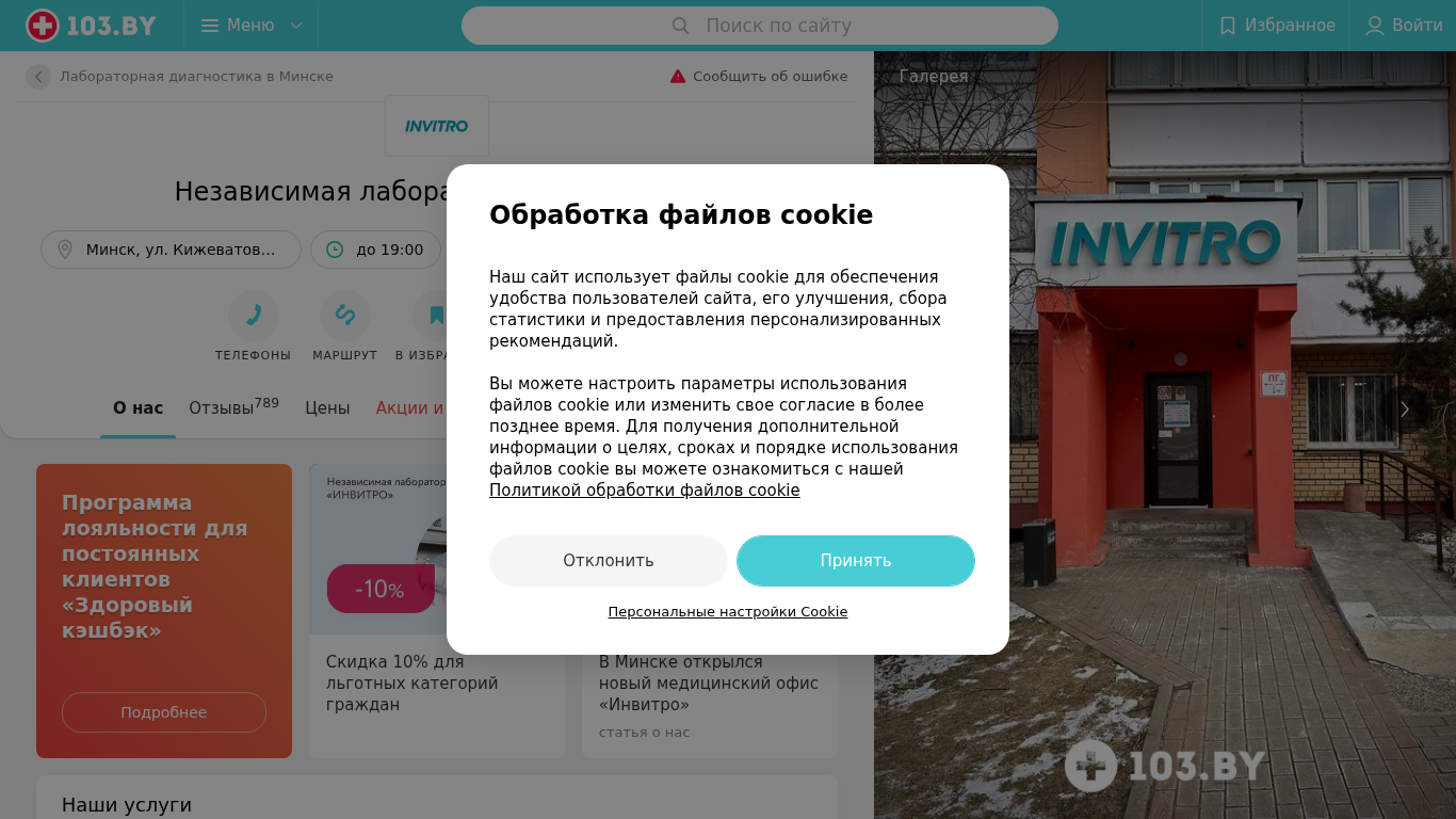 | SEO-описание | Независимая лаборатория ИНВИТРО Минск ул. Кижеватова 7/2 – телефоны, время работы, отзывы и схема проезда в каталоге медицинского портала 103.by. |