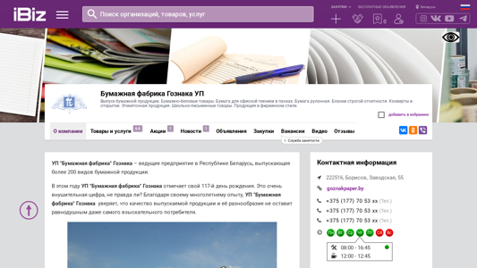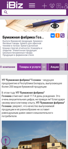 | AI-анализ | This website is a paper factory, Goznak UP, producing paper products. It offers various types of paper-based goods such as office paper, rolled paper, report forms, school and writing supplies, envelopes, opening cards, and label production. The factory is located in Borisov, Belarus, at the address: 222516, Zavodskaya, 55. |