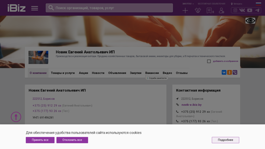| Название / Заголовок | Новик Евгений Анатольевич ИП - Производство и реализация ветоши. Продажа хозяйственных товаров, бытововой химии, инвекторы для уборки, х/б перчаток и технического текстиля. . 222512, Борисов, |