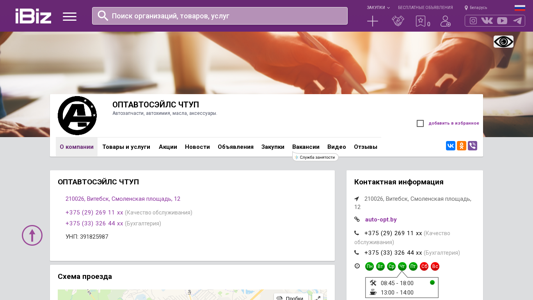 | Название / Заголовок | ОПТАВТОСЭЙЛС ЧТУП - Автозапчасти, автохимия, масла, аксессуары.. 210026, Витебск, , Смоленская площадь, 12 |