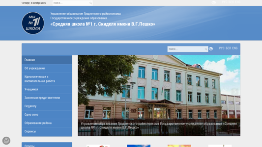 | AI-анализ | The website is for Middle School No. 1 in the city of Skidel, operated under the Grodno Regional Executive Committee's Education Department in Belarus. The site offers information about the school, its activities, and various educational initiatives such as the "School of an Active Citizen" and electronic versions of textbooks. It also features a rating portal for evaluating the quality of services and administrative procedures of organizations in Belarus. The school's year of renovation is mentioned, along with various news, events, and announcements, including information about a family remembrance event for the Holocaust, regional actions, and a patriotism competition. The site also includes a volunteers section, details about a sixth school day, and a resource center for vocational guidance. The domain is skidel1.grodruo.by. |