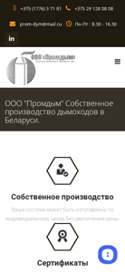 | AI-анализ | --- This online resource is an e-commerce platform for purchasing chimneys in Minsk, Belarus, with delivery options. The title of the website is "Купить дымоход в Минске с доставкой" (Buy a chimney in Minsk with delivery). The description contains keywords related to chimneys, steel, maps, and standard and non-standard elements. The website offers various types of chimneys, including one-piece, sandwich (insulated), and coaxial chimneys, as well as tubes and elements for mounting. The company, OOO "Промдым," produces chimneys in Belarus. The website includes a section for contacts, which lists a phone number and an email address, and operating hours from Monday to Friday, 8:30-16:30. The website also offers custom production without price increase and cert |
