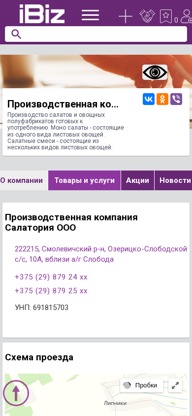 | Название / Заголовок | Производственная компания Салатория ООО - Производство салатов и овощных полуфабрикатов готовых к употреблению. Моно салаты - состоящие из одного вида листовых овощей. Салатные смеси - состоящие из нескольких видов листовых овощей.. 222215, , Озерицко-Слободской с/с, 10А, вблизи а/г Слобода |