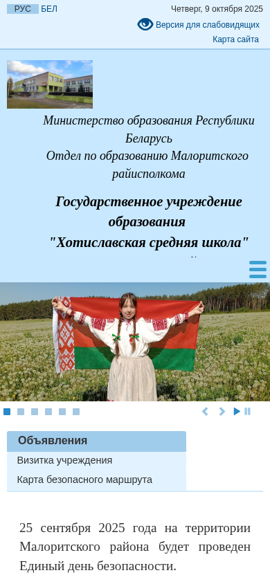 | AI-анализ | The web project "Хотиславская СШ" (Hotilsavskaya SS, Hotilasva Secondary School) is a website of a public educational institution located in the Malorita District of Belarus. The website provides information about the school, its structure, work schedule, administrative procedures, contacts, and various services. Keywords associated with the website include "school," "education," "Belarus," "district," "ministry," and "administration." The website is primarily focused on students, parents, and educational authorities, with sections on academic offerings, extracurricular activities, and school policies. The website includes features for electronic applications, document downloads, and contacts for various school departments. The design is standard, with a Belarusian language interface and a color scheme that matches the school's logo. The website also includes sections on school history, notable achievements, |