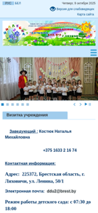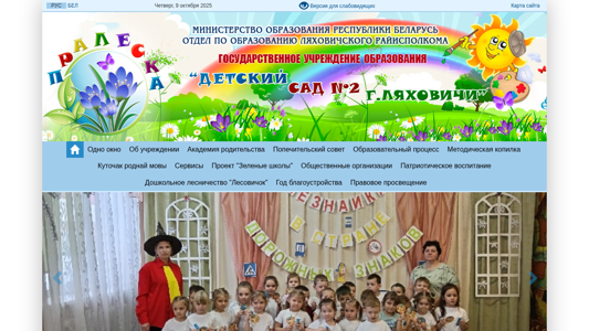 | AI-анализ | --- The web project "Детский сад №2 г.Ляховичи" is a website dedicated to a kindergarten located in the city of Liaховичи, Belarus. The site contains information about the kindergarten's administration, pedagogical staff, social-pedagogical and psychological services, and various educational and recreational programs. Keywords associated with the website include 'kindergarten', 'Liaховичи', 'education', 'childcare', and 'preschool'. The website also features sections on administrative procedures, electronic application, and a telephone directory. The color scheme is standard, with text in black and images off. Additional features include a map of the site, a news archive, and a guestbook. The website is compliant with various normative legal acts and offers services such as 'Зеленые школы' (Green Schools |