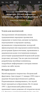 | AI-анализ | This website is for the State Cultural Institution "Museum of Folk Craft 'Bezdezh Fartushok'". It provides news and event information, visitor information, prices, exhibitions, collections, and materials for museum professionals. The website is in Russian and Belarusian languages, and includes a search function for the museum on museum.by, an entrance for museums, and information about services for visitors such as guided tours, traditional craft demonstrations (including weaving and embroidery), carriage rides, dressing up in folk costumes, musical accompaniment for tours, wedding registrations, and overnight stays in a country cottage. The museum, located in the Brest Oblast, Belarus, offers educational complexes for visitors which can be learned about on the museum's website. The Museum of Folk Craft 'Bezdezh Fartushok' was established on January 1 |