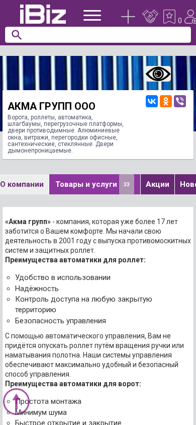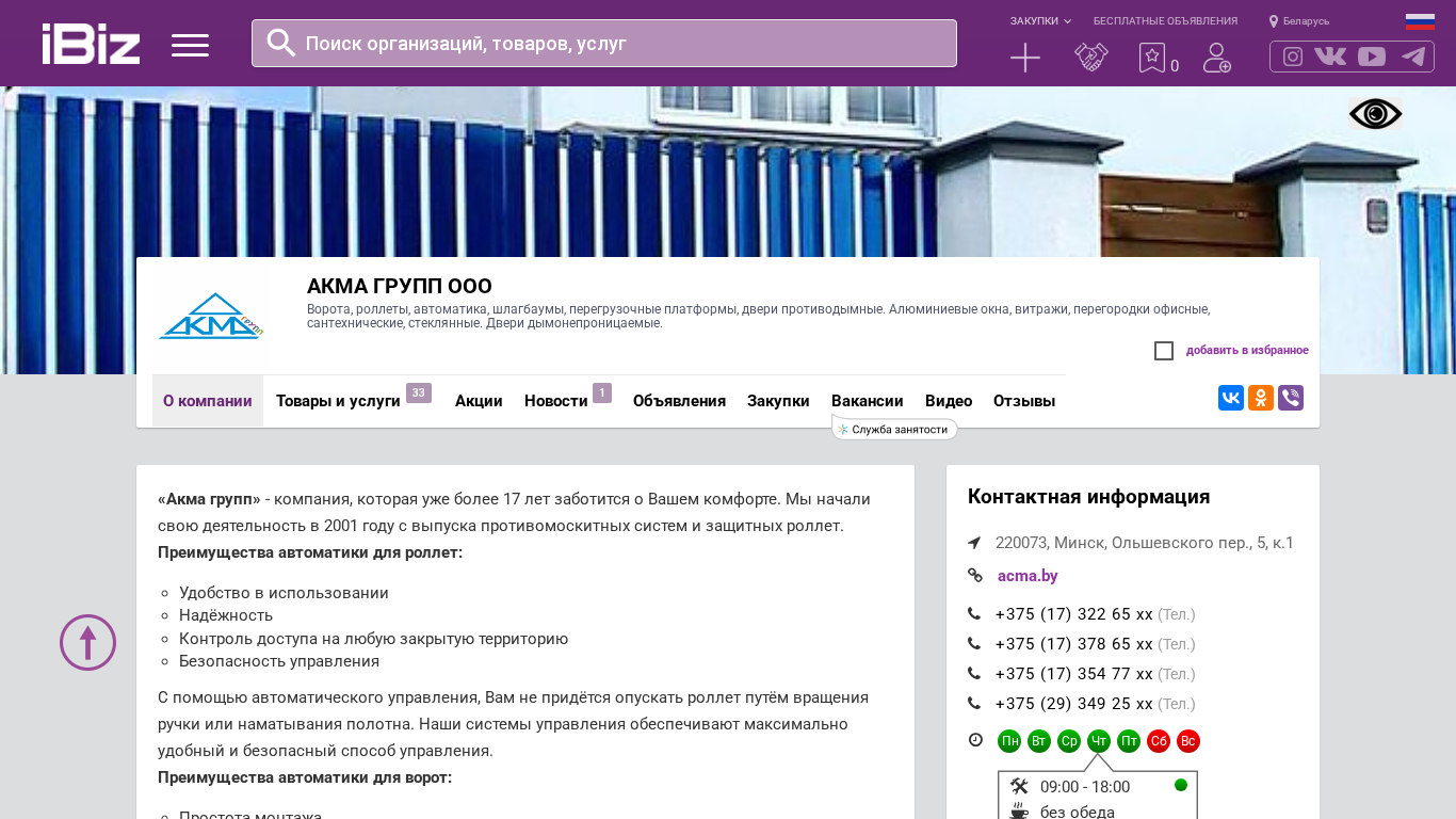 | AI-анализ | The web project "АКМА ГРУПП ООО" is a company based in Minsk, Belarus, specializing in gates, rollers, automation, shutters, loading platforms, and fireproof doors. They also offer aluminum windows, glass partitions, and sanitary partitions. The company provides smoke-proof doors as well. The website includes sections for company information, products and services, news, and announcements. The company was established in 2001 and initially focused on mosquito protection systems and roller shades. The benefits of automatic control for roller shades include convenience, reliability, access control, and safety. The benefits of automatic control for gates include ease of installation, minimal noise, quick opening and closing, and operation in various climatic conditions. Their product range includes over 15 categories: rollers, sliding gates, aluminum windows and |
