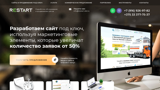 | AI-анализ | The portal Restart is a full-service website development and marketing firm. They offer a custom-made website solution, incorporating marketing elements that increase inquiry volume by 50%. The site includes sections for services, commercial proposals, portfolio, tools, and contacts. The company specializes in website design, development, and marketing, providing examples of completed projects in various industries such as aluminum window installation, cargo transportation for legal entities, server equipment sales, and construction services. Services include website creation, aluminum window repair in Moscow, freight transport for legal entities, server equipment, construction control in Germany, foundation piles for drilling, and mortgage loans for construction. The site offers a solution to common problems faced during website development, addressing issues such as unmet expectations, lack of activity or communication from the executor. The site promises a guaranteed result, adherence to deadlines, and use of modern marketing techniques. The site |