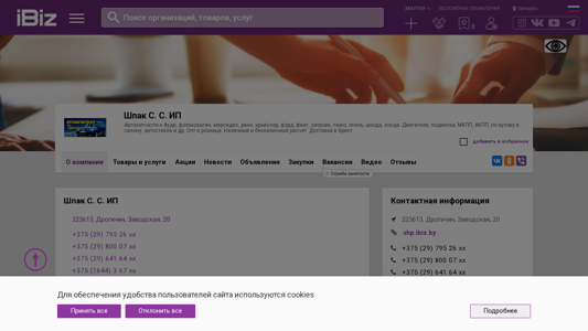 Название / Заголовок | Шпак С. С. ИП - Автозапчасти к Ауди, фольксваген, мерседес, рено, крайслер, форд, фиат, ситроен, пежо, опель, шкода, хонда. Двигатели, подвеска, МКПП, АКПП, по кузову и салону, автостекла и др. Опт и розница. Наличный и безналичный расчет. Доставка в Брест.. 225613, Дрогичин, , Заводская, 20 |