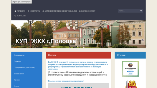 | AI-анализ | --- The portal jkhpolotsk.by is a Belarusian government website primarily focused on administrative procedures and contacts in the city of Polotsk. Keywords include 'полоцк' (Polotsk), 'безопасности' (safety), 'тел' (phone), and 'контакты' (contacts). The site offers sections for 'Административные процедуры' (Administrative Procedures), 'Вопрос-ответ' (Question-Answer), and 'Новости' (News). Services include 'Капитальный ремонт' (Capital Repair), 'Экономия' (Economy), and 'Аренда' (Rent). The site also provides information on emergency procedures, such as heating system activation and vaccination reminders. Users are encouraged to ensure their homes are properly ventil |