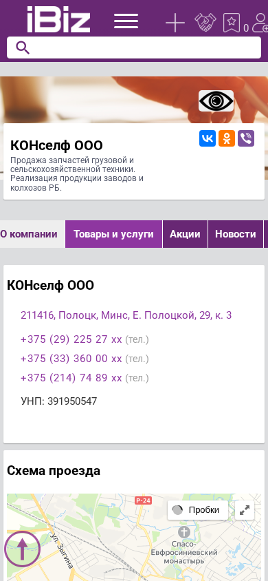 | Название / Заголовок | КОНселф ООО - Продажа запчастей грузовой и сельскохозяйственной техники. Реализация продукции заводов и колхозов РБ.. 211416, Полоцк, , Минс, Е. Полоцкой, 29, к. 3 |