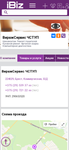 | AI-анализ | The web project "VirazhServ.ibiz.by" is a Belarusian .BY domain dedicated to an auto service and repair company named VirazhServ CHSTUP. The company offers various services including tire mounting, exhaust system repair, body repair, argon welding, and computer diagnostics. The contact information and company address are provided: 224029, Brest, Kommercheskaya Street, 32D. The website is open for business from Monday to Friday, 09:00-18:00, without lunch breaks. The company can be reached by calling +375 (29) 539 37 xx or +375 (29) 721 22 xx. The company is categorized under 'Auto Service and Repair' and 'Technical Service Stations |