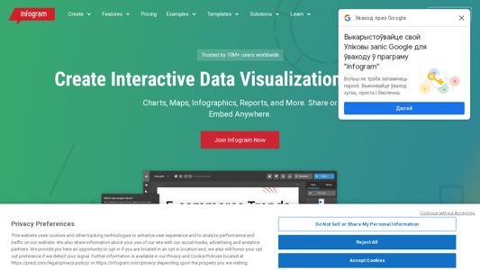 | AI-анализ | country: BY language: EN categories: [Business, Technology, Design] This website, titled "Create Interactive Data Visualizations with AI | Infogram," is a platform for designing and creating infographics, charts, dashboards, maps, and other data visualizations using AI technology. The website offers easy-to-use tools for users to design and share interactive data visualizations across various platforms. Keywords associated with the website include "infographic," "infographics," "maker," "graphics," "visualize," "chart," and "online." The top words on the website are "and," "your," "with," "data," "the," "you," "chart," and "not." The website provides features such as AI chart recommendations, interactive content, embeds, a chart and graph generator, and custom maps. Users can create a variety of visualizations including pie charts, line |