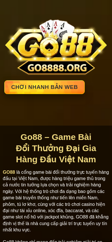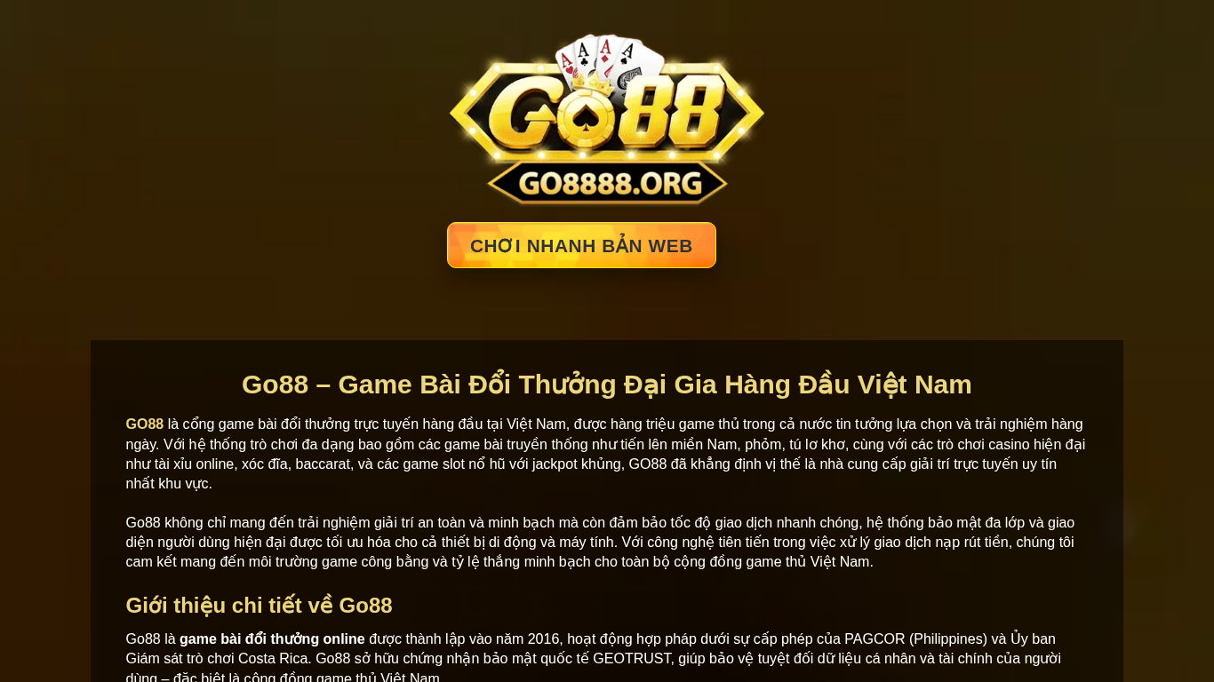 | SEO-описание | Go88 - Cổng game bài đổi thưởng trực tuyến hàng đầu Việt Nam. Tải Go88 trải nghiệm game bài, nổ hũ, xóc đĩa, tài xỉu, bắn cá, đỉnh cao mỗi ngày. |