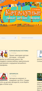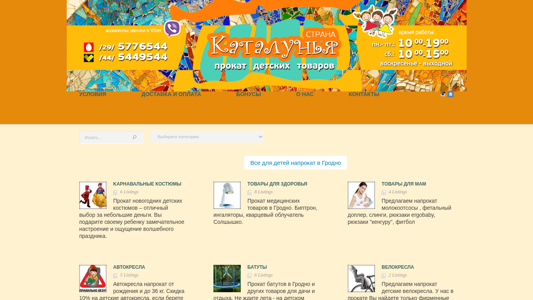 | AI-анализ | The web project "Prokat detskikh towars v Grodno | Strana Kataluňya" is an online rental service for various children's items in Grodno, Belarus. The offered inventory includes car seats, strollers, children's bicycles and swings, baby scales, jumpers, electric cars, musical chairs, carousels, and toys. Additionally, there are listings for new year costumes, health-related items, items for mothers, and carnival costumes. The website provides delivery and payment conditions, bonuses, and contact information. Categories include auto chairs, baby scales, mats, strollers, developing centers, maneuvering chairs and swings, playground equipment, musical instruments, and toys. There are five listings for car seats, six for baby scales, eight for health-related items, four for items for mothers, five for auto chairs |