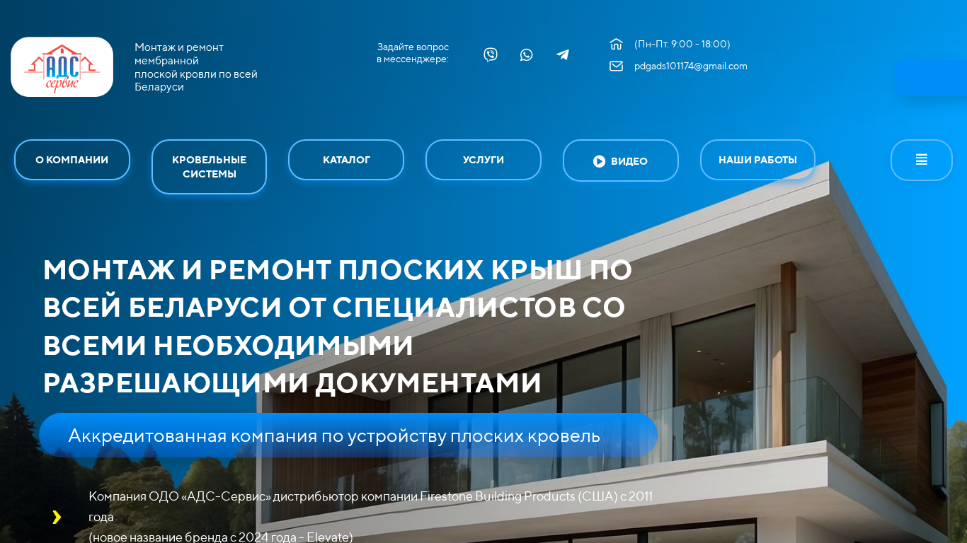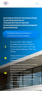 | AI-анализ | The web project "Плоская кровля монтаж и ремонт в Минске и по всей Беларуси" (Flat Roof Installation and Repair in Minsk and throughout Belarus) is a website dedicated to the installation and repair of flat roofs across Belarus. The company offers UltraPly and TPO membranes from a US manufacturer for their roofing projects. The website provides contact information for inquiries through messenger, email, and phone. The company is an accredited installer for Firestone Building Products (now Elevate) in Belarus since 2011. They offer a full package of documents for the supply and installation of roofing materials in Belarus, including technical certificates, declarations, and attestations. The company directly provides and installs flat roofs using EPDM and TPO |