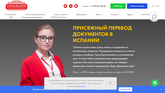 | AI-анализ | The website is a professional translation service for official documents in Spain, specifically in Barcelona, offering quick and prepared solutions for those in need. The title is "Официальный перевод документов в Испании (Traducción jurada)" and the description states, "Вам нужен срочный перевод официальных документов в Испании? Обращайтесь к нам мы все подготовим как надо и в самый быстрый срок!" The keywords include "традуктор хурадо," "официальный переводчик," "переводчик," "перевод документов," and "traductor jurado ruso." The top_words indicate a focus on "перевод," "документов," and "испании," with mentions of |