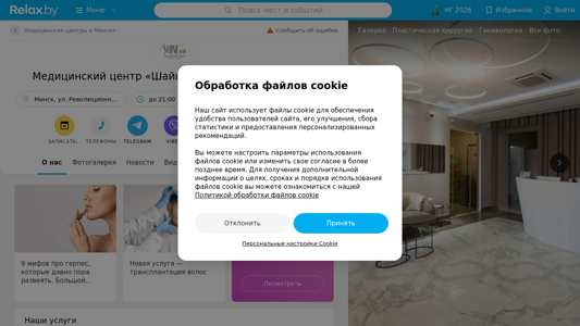 | AI-анализ | This online resource provides information about the medical center "Shine-est-Medical on Nemiga" in Minsk, Belarus, located at Revolutionary Street 26a. The website offers reviews, phone numbers, working hours, and a map to the center on Relax.by. The title and description suggest that the medical center specializes in various medical and cosmetic services. The top words include "center," "Minsk," "Shine-est," and various medical and cosmetic terms such as "laser," "piling," and "cosmetology." The domain belongs to the Relax.by network. The website includes sections for prices, other services, and reviews. It also features a photo gallery, news, and videos. The medical center appears to offer a range of services in cosmetology, laser cosmetology, and surgery, among others. The staff includes specialists in various |