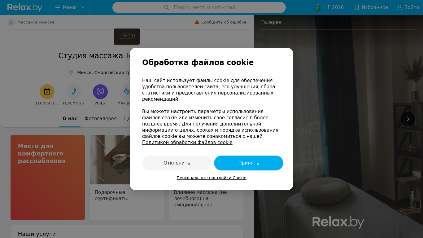 | SEO-описание | Студия массажа Touch me (Тач ми) в Минске – отзывы, телефоны, график работы и карта проезда на Relax.by |