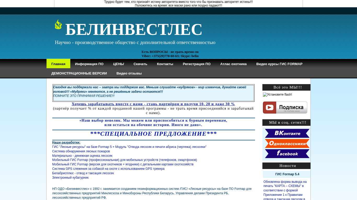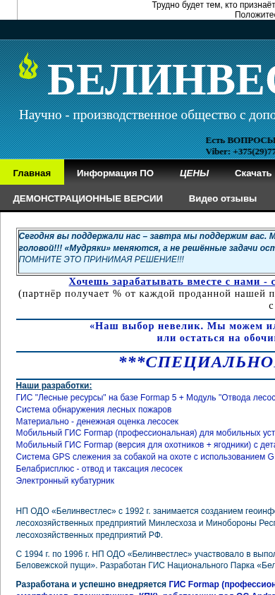 This online resource belongs to Belinvestles, a scientific-production enterprise with additional liability, and provides information about their Geographic Information System (GIS) called Formap for businesses in the forestry industry. The website offers details on Formap's GPS and GLONASS satellite navigation features, its application in forestry management, and the development of Formap software. The system includes functionalities for monitoring forests, such as fire detection and wind damage assessment. Additionally, the site mentions the availability of pricing information, download options, and contact information for inquiries. The website also promotes partnership opportunities, offering various percentages of revenue shares for partners selling their programs. The company has been active in creating geographic information systems since 1992.