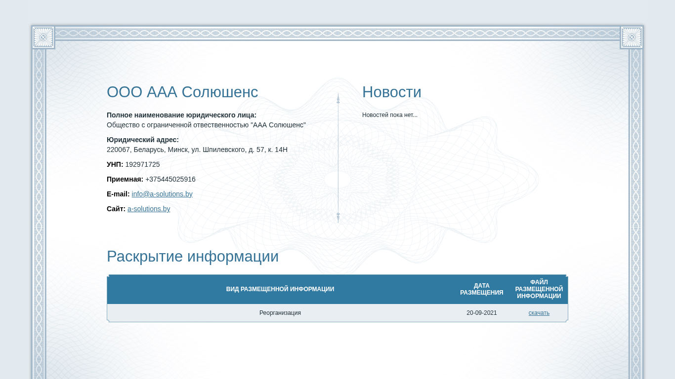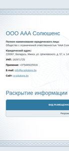 | AI-анализ | The website "ААА Солюшенс ООО" (AAS Solutions) is a Belarusian limited liability company registered under the name "Общество с ограниченной отвественностью 'ААА Солюшенс'" (Obschestvo s ogranichennoj otvetstvennostju 'AAS Solutions'). The company's legal address is in Minsk, Belarus, at ul. Shpilevskogo 57, k. 14N, with the UNP number 192971725. The website can be reached at the email address info@a-solutions.by or by calling +375445025916. AAS Solutions offers a personal cabinet feature with email and password login, but registration is required. The website was reorganized |